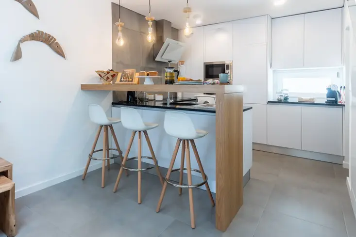 O projeto deu origem a um espaço moderno e funcional, com zona de cozinha e sala em open space no piso térreo, complementado por uma instalação sanitária social, e um mezanino com quarto e casa de banho completa.